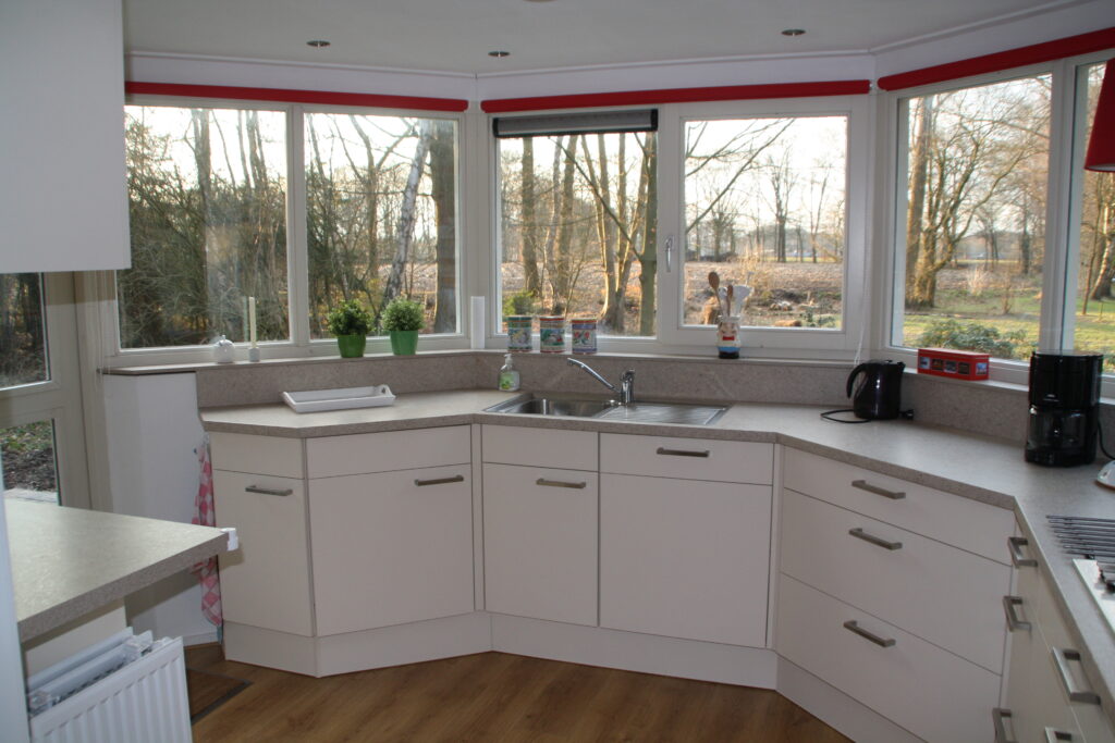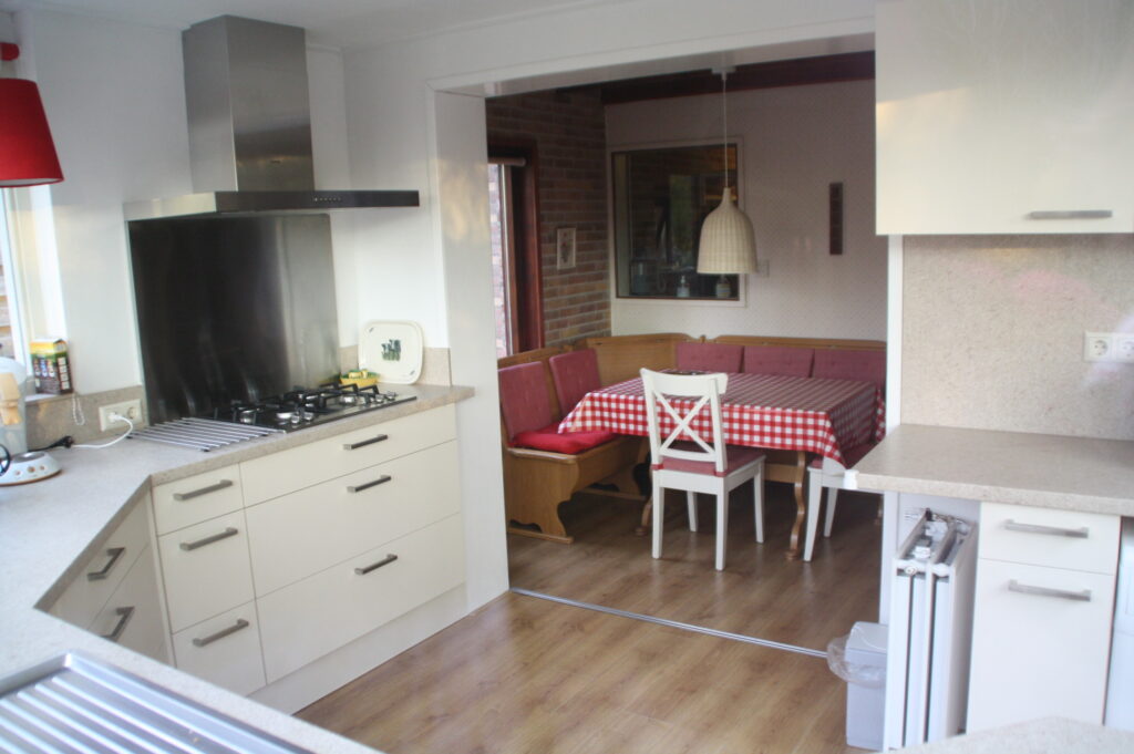 De keuken heeft een ruime, open doorgang naar de eethoek in de kamer.Het uitzicht vanuit de keuken is schitterend, met mooi panorama over de omgeving.